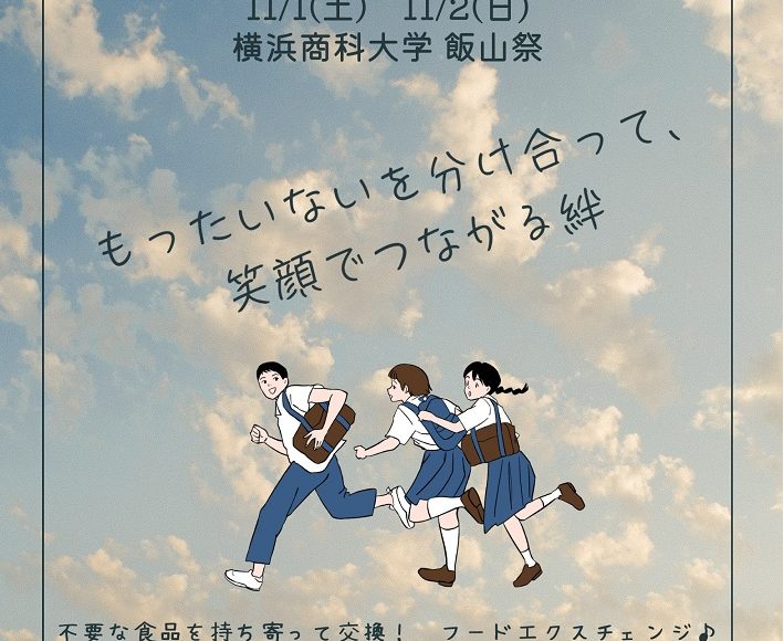 セカンドリーグ神奈川が「食品ロス削減」の講義でご協力している、横浜商科大学「ボランティア活動演習」の履修学生が、このたび、11月1・2日に開催される横浜商科大学の大学祭「飯山祭」において「もったいないを分け合って、笑顔でつながる絆」をテーマにしたイベント「YOKOHAMA FOOD EXCHANGE at 商大」を実施します。