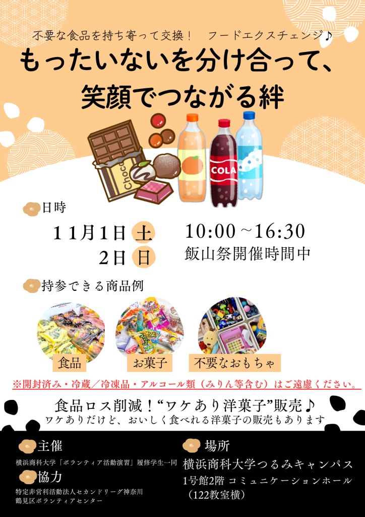 このイベントを通じて、食品ロスを減らしながら、地域のつながりを深めていきたいと思っています。当日は、横浜商科大学「ボランティア活動演習」の履修学生と一緒にお菓子の販売などお手伝いします。 皆さまのご参加を、心よりお待ちしております!